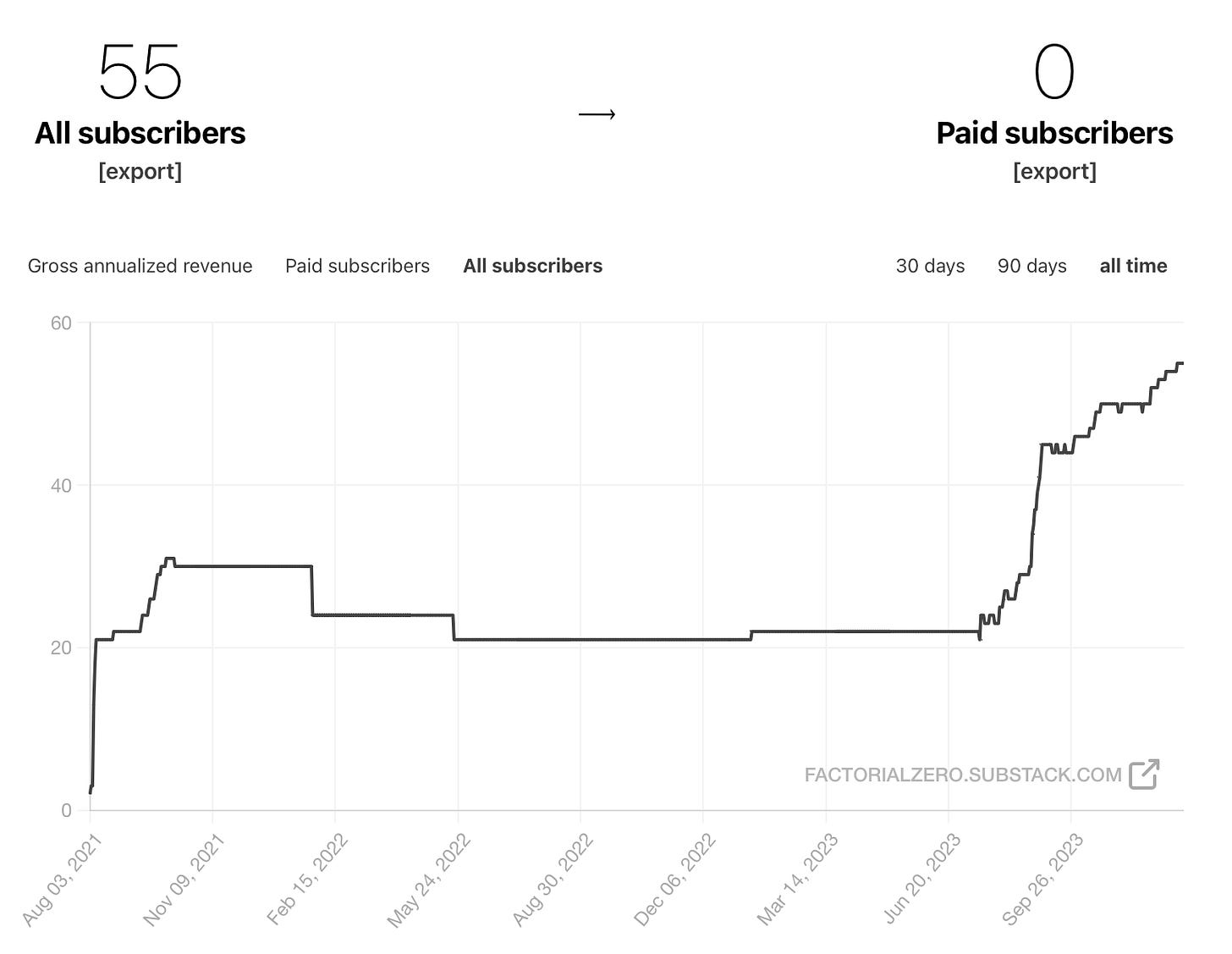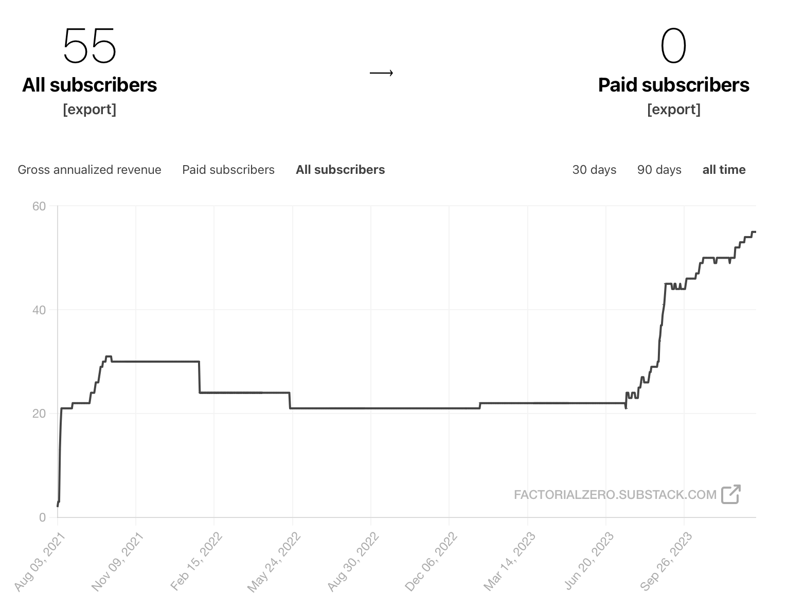 I came back to writing after taking a year and a half long hiatus. When I came back to Substack, I thought that I would make Factorial Zero private. It would become more of a journalling outlet. In my infinite wisdom I cut my subscriber list down, because I didn’t want people that I “didn’t know too well’“ seeing my more personal work. So, after my first year of writing where I’d grown to about 30 or so subscribers, I chopped them away. Snip. Snip.